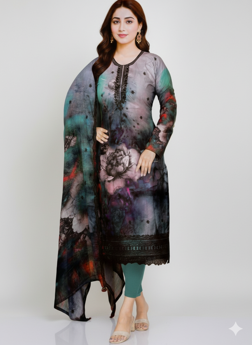Dupatta (Shawl): A coordinating, flowing dupatta/shawl that mirrors the abstract digital print. The generous size and light fabric allow the dramatic print to drape beautifully.