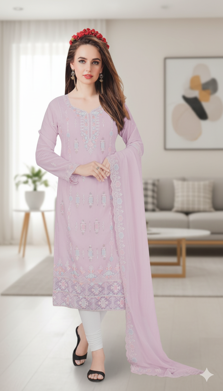 এই লাইট পিঙ্ক স্যুটটি প্যাস্টেল লাভারদের জন্য আদর্শ। হালকা এমব্রয়ডারি, নিখুঁত কটন ফেব্রিক এবং স্নিগ্ধ ডিজাইন একে করে তুলেছে ডেইলি-লাক্সারি স্টাইলের একটি পারফেক্ট চয়েস।